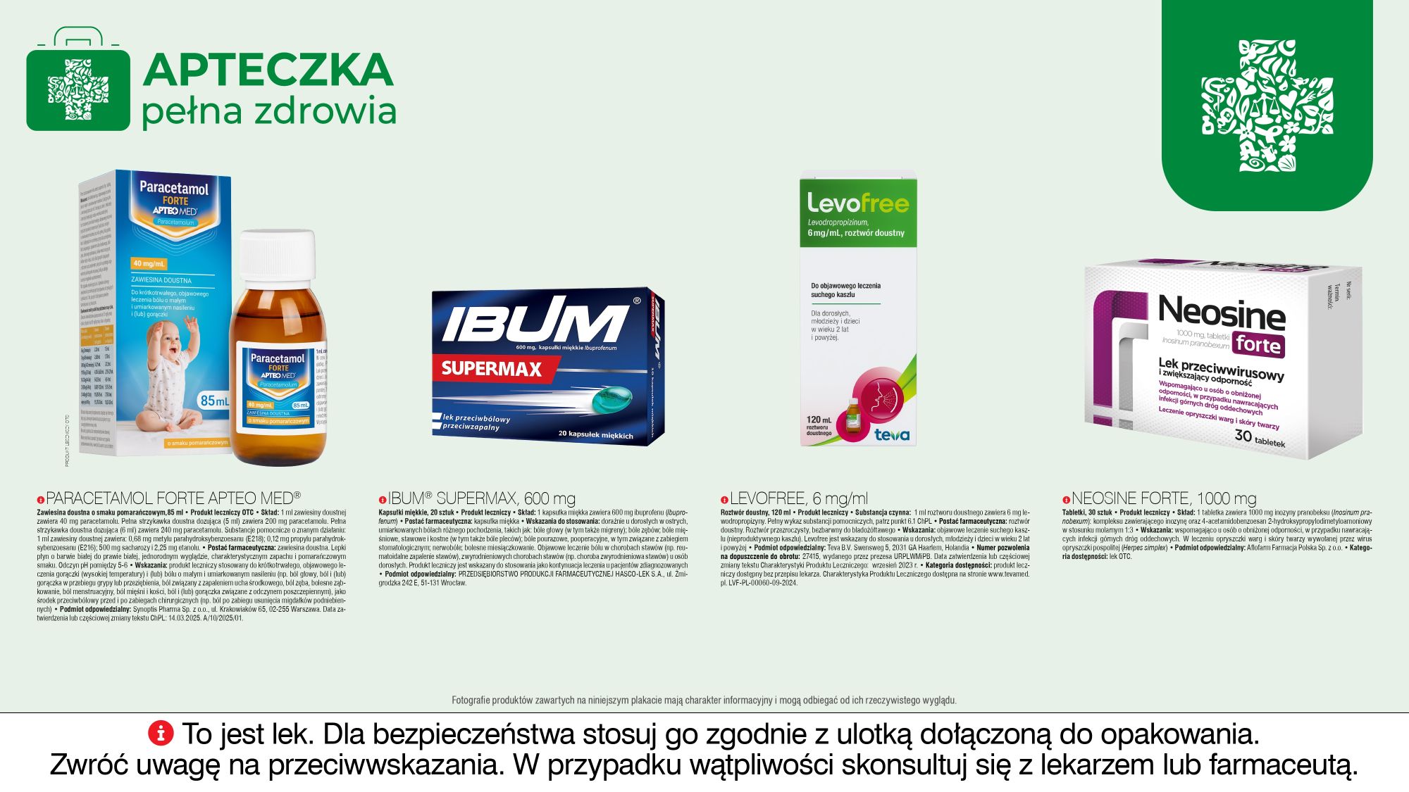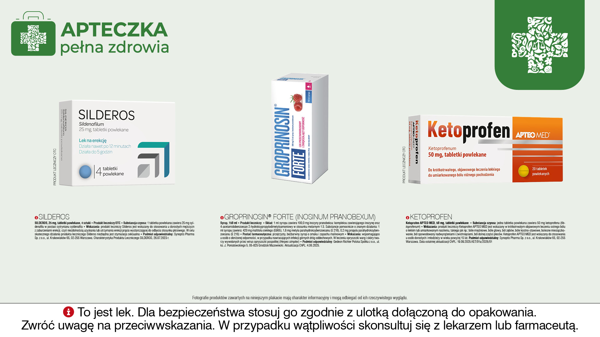 Wśród szerokiej oferty leków i suplementów diety, szczególnie polecamy preparaty całkowicie naturalne (wysokiej jakości) takich firm: jak: Solgar, Aboca, Labofarm, Produkty Bonifraterskie. Oferujemy dermokosmetyki firm : CeraVe, Emolium, Organic Life, Bioderma, Bioliq, Gewohl, Sylveco, Biokap, Avene, Cetaphil, Lirene, Physiogel, Cera Plus, Oillan, Ziaja, Medispirant, Bepanthen Derma, Mediderm, Medical Hemp, Vichy, La Roche Posay, Eris, Dermedic, Iwostin, Apteo.